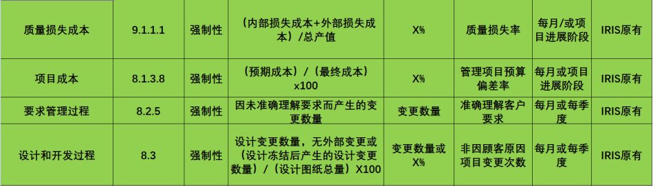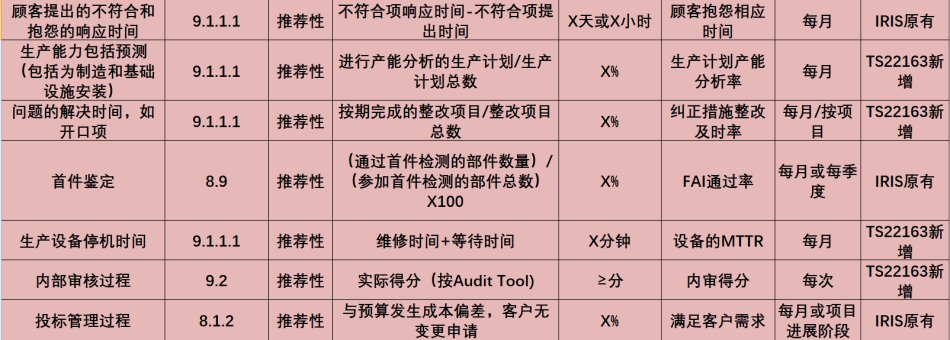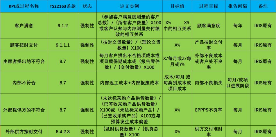 SO/TS22163要求轨道交通企业设定10个强制性的KPIs和7个推荐性的KPIs,要求识别,建立,实施和保持形成文件的KPIs, 用以监视和改善其过程、产品、服务和项目的绩效。